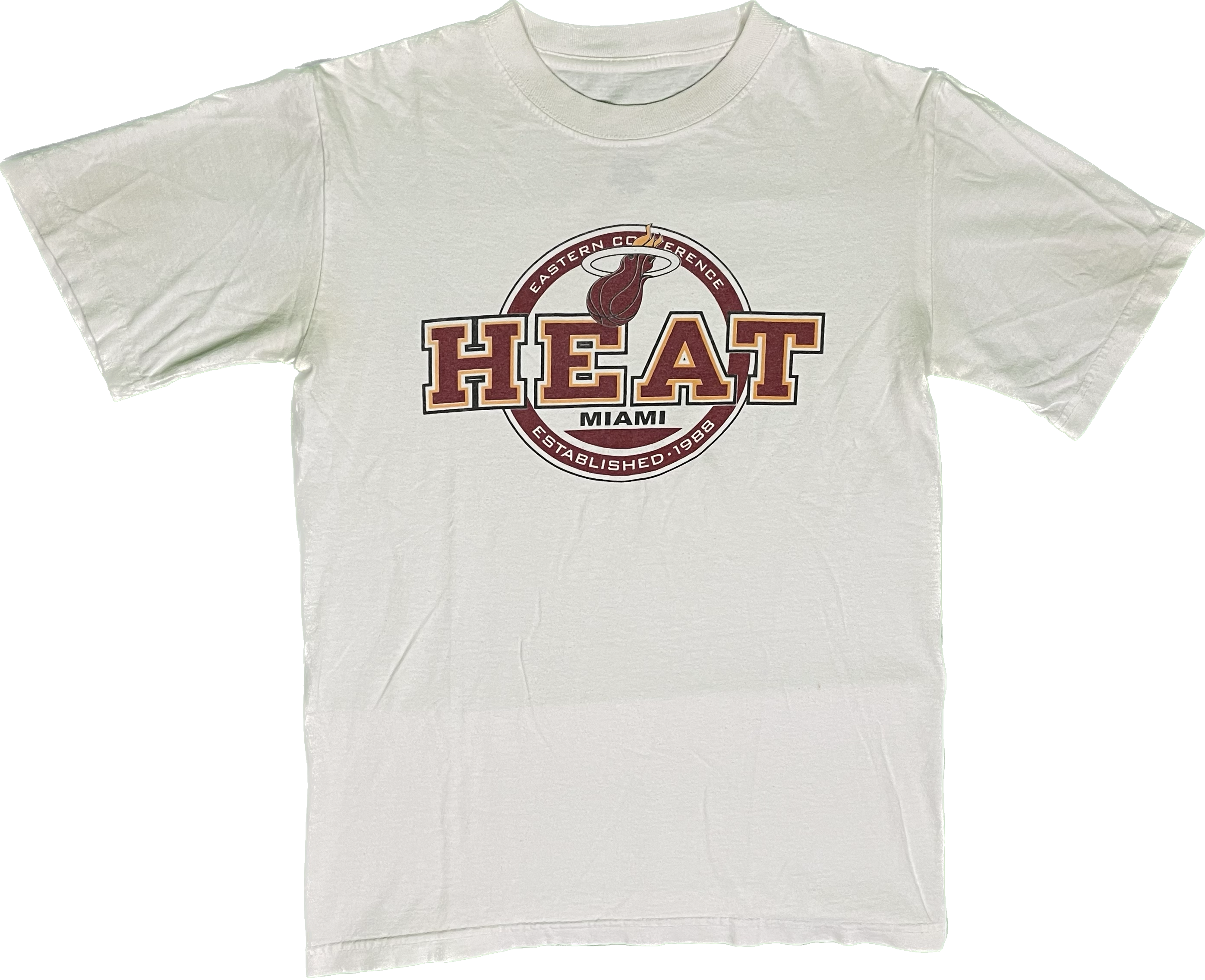 With its classic design, this T-shirt proudly features the official Miami Heat logo, symbolizing the team's dedication, skill, and unwavering spirit. The logo captures the essence of the Heat's iconic flame-inspired design, representing the intensity and passion they brought to the court.